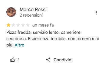 L’85% di chi vende casa sceglie l’agenzia dopo aver letto le recensioni su Google. Se leggono attacchi sulla tua onestà senza una replica impeccabile, chiameranno il tuo concorrente. Ma tu sei impegnato nei rogiti, sei stanco, e l'ultima cosa che vuoi fare è litigare online.